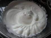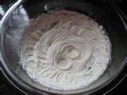 蛋白放入干净的无水无油的容器里,加糖和醋打至硬性发泡