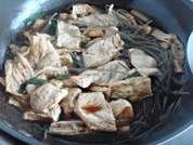 将炸腐竹和红薯粉一起放入,加水入锅,水量要淹住所有材料;大火烧开后转小火慢慢炖10几分钟。