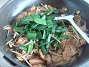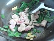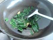 接着放蒜苗下锅,炒匀后加盐,鸡精,麻油调味即可。