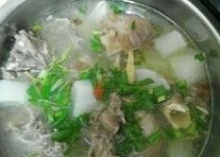 4、待羊肉入味并且快9成熟时捞出先前加入的调料,然后拔萝卜放进去并且加入葱丝、盐、味精、鸡精、转小火炖大概15分钟。