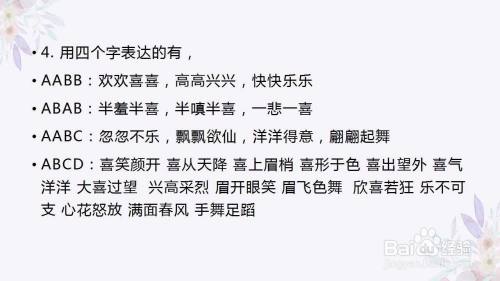 4. 用四个字表达的有,欢欢喜喜,高高兴兴,快快乐乐,忽忽不乐,洋洋得意,翩翩起舞,喜笑颜开,喜从天降,喜上眉梢,喜形于色,乐不可支,心花怒放,满面春风。