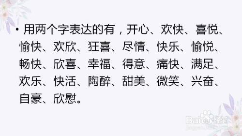 用两个字表达的有,开心、欢快、喜悦、愉快、欢欣、狂喜、尽情、快乐、愉悦、畅快、欣喜、幸福、得意、痛快、满足、欢乐、快活、陶醉、甜美、微笑、兴奋、自豪、欣慰。