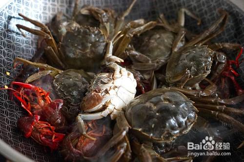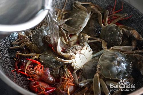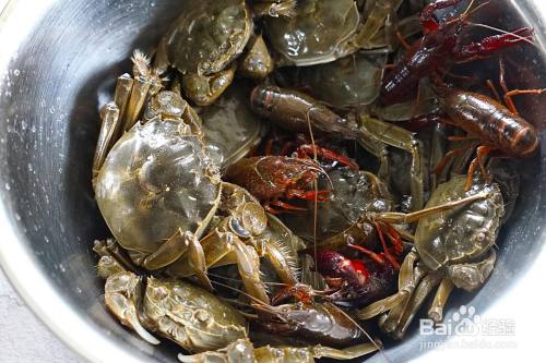 螃蟹和小龙虾先放在水中清洗后再用刷子将蟹毛、蟹壳、虾肚皮刷洗干净,介意的话,可将虾腮部剪去,螃蟹腮部去不去大家请随意,我做的时候是不去腮的。