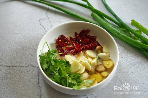 准备好葱姜蒜、红干椒、香菜,并切洗好。