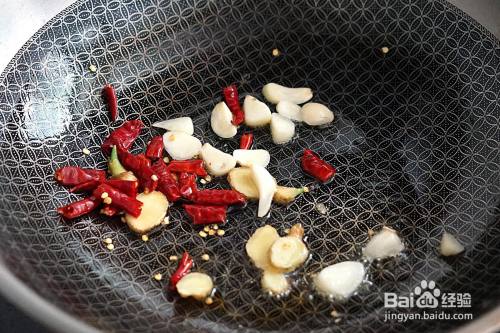热锅凉油,放入姜、蒜、红辣椒翻炒十几秒钟,炸出香味即可。