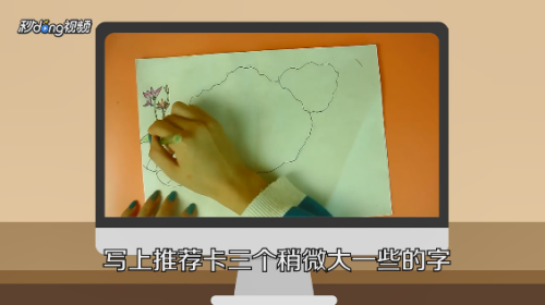 用签字笔将边框仔细地勾画出来,用彩色铅笔将荷花涂色,在小的边框上写上“推荐卡”三个稍大的字。