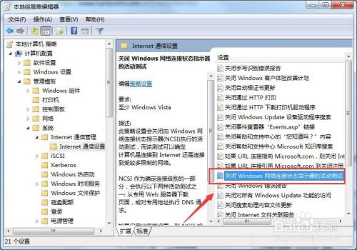 依次展开“计算机配置-管理模板-系统-Internet通信管理-Internet通信设置”,双击打开“关闭 Windows 网络连接状态指示器的活动测试”。