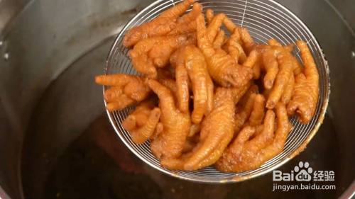 将鸡脚放卤水里卤制5分钟,泡一个半小时,即可出锅食用。