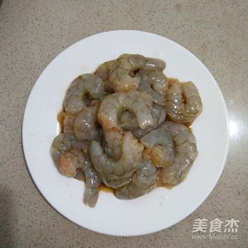 2虾剥壳,用牙签挑出虾线,清洗干净沥干,放一茶匙生抽,少许淀粉,料酒,盐腌制一小会