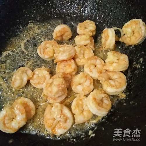 3取锅热油爆香,偏炒一下虾仁变色断生捞出