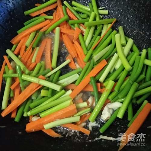 4留底油爆香蒜末,倒入胡萝卜丝和蒜苗偏炒,中间记得撒点水翻炒,以免沾锅,不要盖盖子