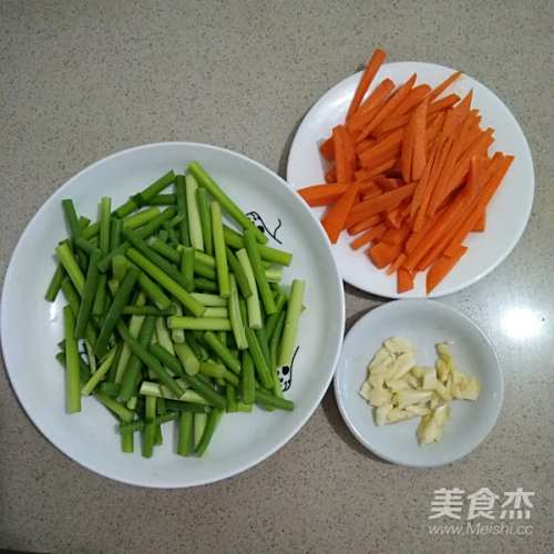 1备好所需用料,胡萝卜切丝,不要切太细了,蒜苗切段,蒜拍碎