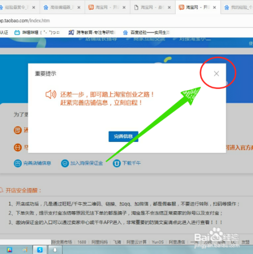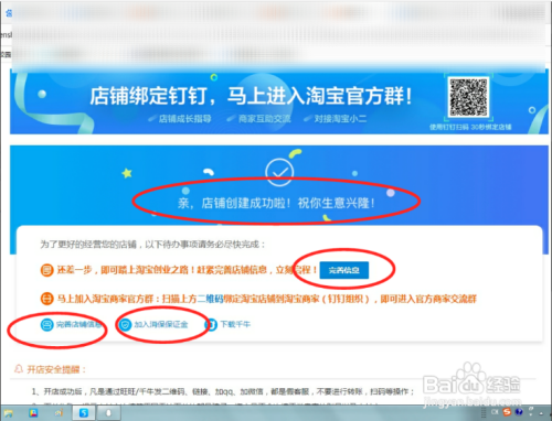 第八步:关闭弹出的重要提醒,可以看到网页提醒店铺创建成功。开店成功。
