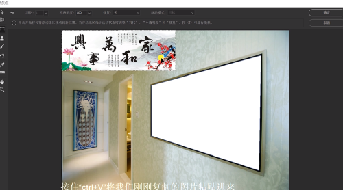 6移动的挂画里面,但是没有填充满挂画,按住CTRL+T缩放大小,调整好后直接点击“确定”。