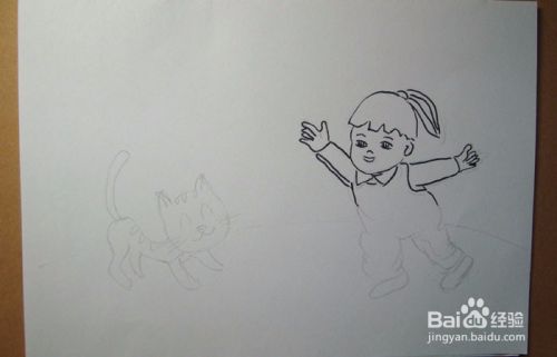 铅笔画个草稿布局,用黑色的彩色笔,先从小女孩的头部和头发开始画,并画出小女孩的嘴巴和眼睛,小女孩手臂要画准确,如下图所示。