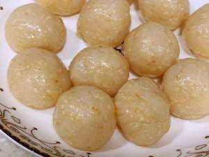 加入烤香的椰蓉和白芝麻翻拌均匀,待馅料放凉后分成16份,揉圆备用