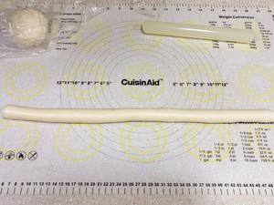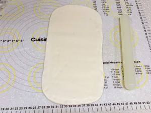 从长边一端开始卷成长条状,卷好后稍稍搓长搓匀,两个都做好后盖保鲜膜松弛十分钟