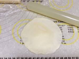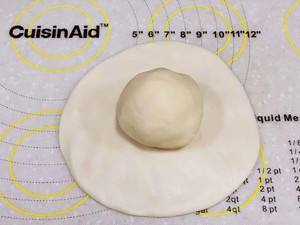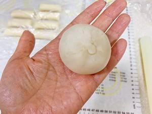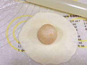 放上糯米馅料,包好捏紧收口,擀成扁圆形