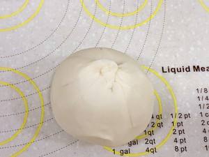 松弛好的水油皮压扁,包入油酥,慢慢捏紧收口,两个依次包好收口朝下放置,盖保鲜膜松弛10分钟左右