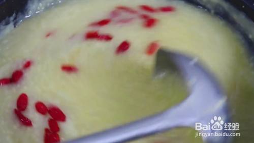 锅中水开后,下入干净的小米熬煮,中途加入辅料增加粘稠度,最后加入枸杞焖煮一分钟即可食用。