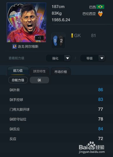 门将——迭戈-阿尔维斯(忠诚赛季):阿尔维斯在2011年加盟了巴伦西亚,之后就成为了球队的主力门将,他的扑救出色,场上也很努力,不过并没有达到世界顶级的水平,在游戏中他的身高只有187,所以扑救距离身体远的球,会出现一些失误。