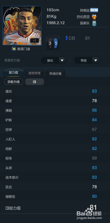 中后卫——奥塔门迪(14T赛季):奥塔门迪在巴伦西亚的一个赛季展现出了非常出色的竞技状态,他的防守出色,而且头球能力太恐怖了,在游戏中他也是出色的中后卫,除了身高偏矮,就没有什么不足了。