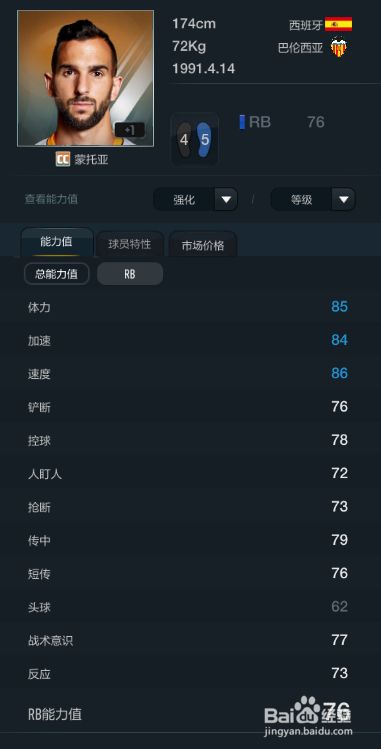 右后卫——蒙托亚(洲际冠军赛季):蒙托亚成名于巴塞罗那,可惜他在球队并没有位置,2016年他来到了巴伦西亚,,表现还算及格,在游戏中他的双速和体力很不错,不过其他能力值都在80以下,需要高强化再使用。