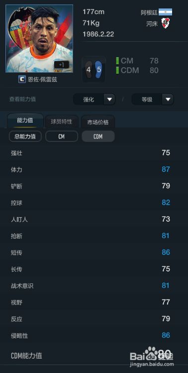 后腰——恩佐-佩雷兹(队长赛季):佩雷兹在巴伦西亚的两个半赛季,是球队的主力后腰球员,他在场上传球出色,体力充沛,在游戏中也很好的体现出来了,他的体力达到了87,传球出色,中场拦截也是顶级的,就是身体有些瘦弱,身体素质还需要加强。