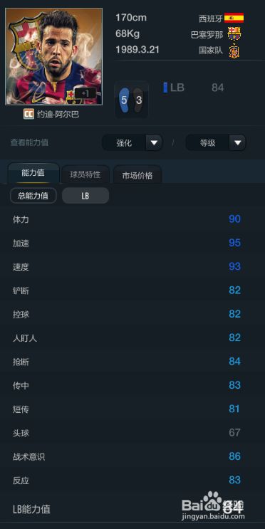 左后卫——约迪-阿尔巴(洲际冠军赛季):阿尔巴现在是西班牙的主力边后卫,阿尔巴的优秀表现就是从巴伦西亚开始的,之后他表现越来越出色,2014年被巴萨用1400万欧元挖走,在游戏中他的能录也没得说,速度快,传球好,防守也出色,就是身高170,有些矮,不过总体来说是一名顶尖的边后卫。