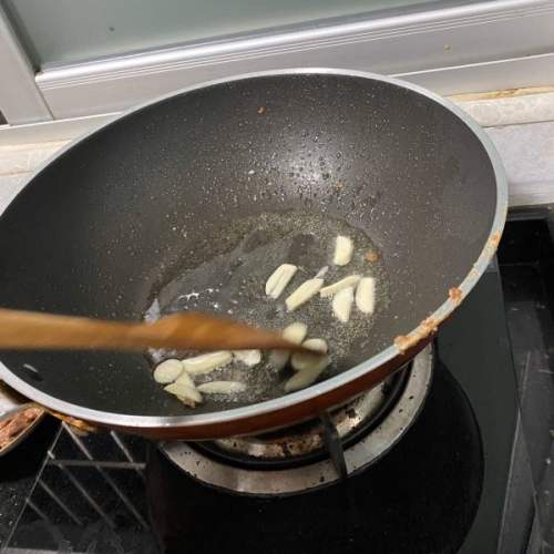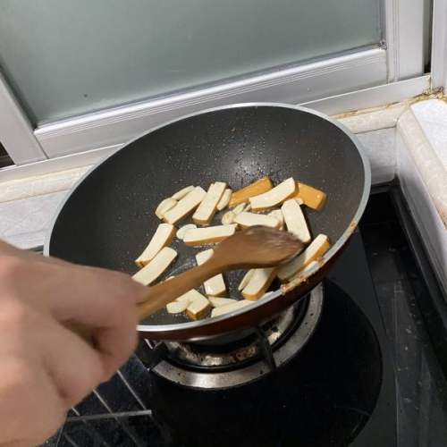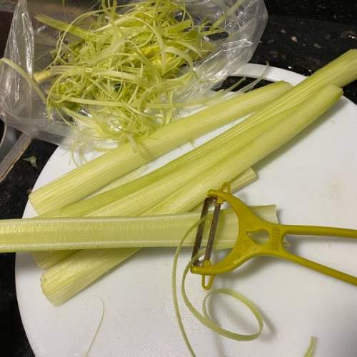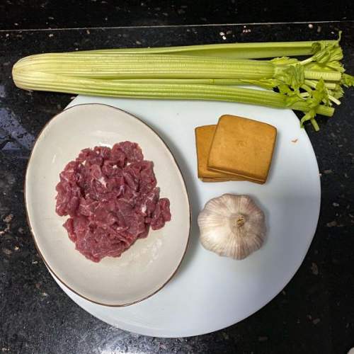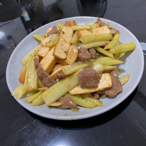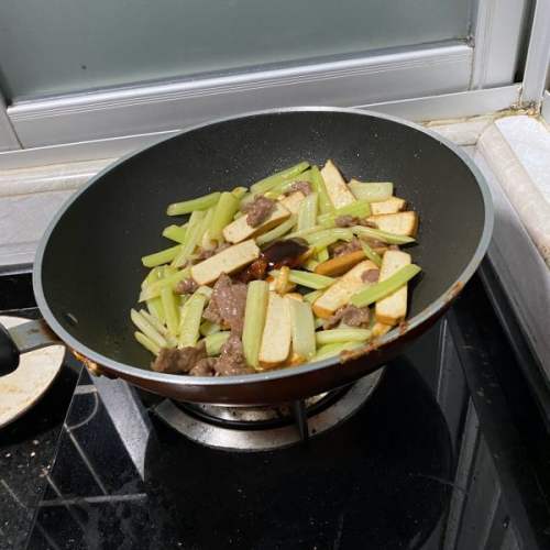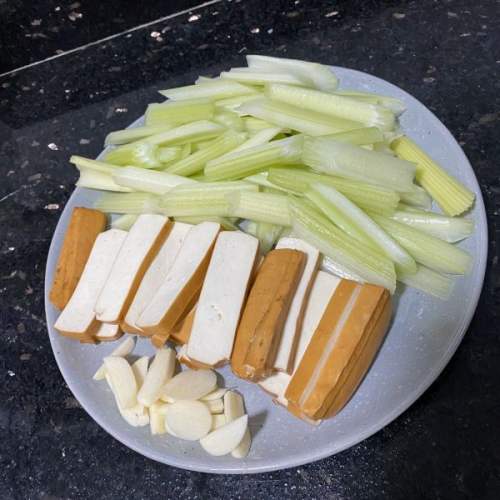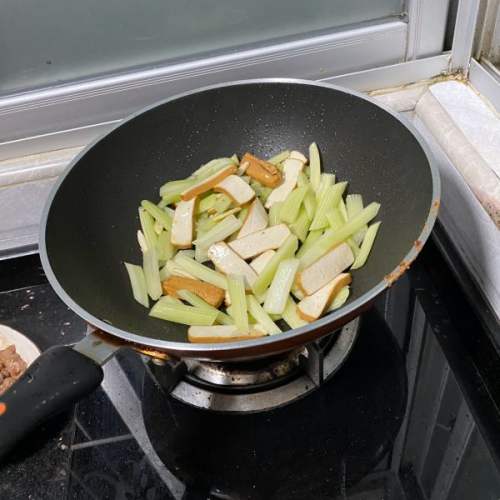 9放西芹一起翻炒,下盐跟鸡精调味。