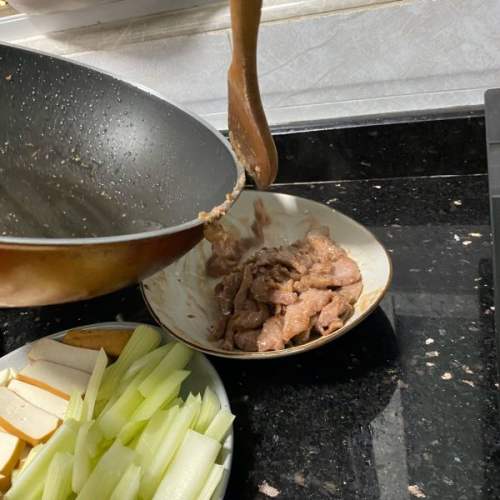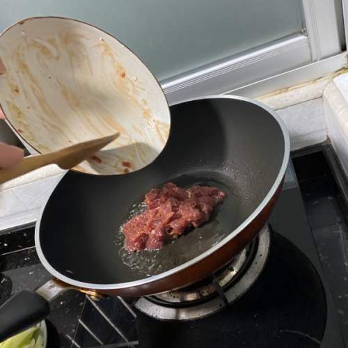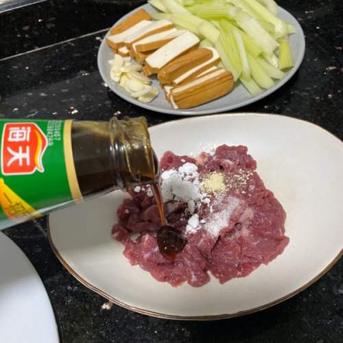 4牛肉提前半小时腌制:生抽、蚝油、盐、鸡精、生粉、油。