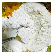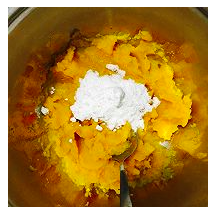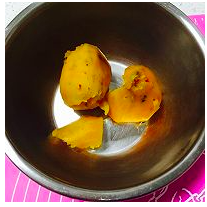 红薯去皮蒸熟后取出放入容器中,红薯捣成泥依自己口味加入适量的糖粉