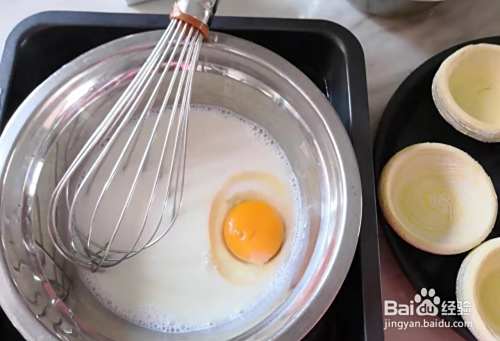 将加热过的牛奶倒入盆中,加入鸡蛋和糖,用打蛋器搅拌均匀。