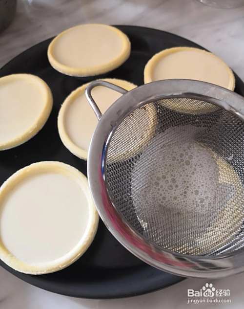 将蛋挞皮平铺在烤盘上,将蛋挞液过筛倒入蛋挞皮中。
