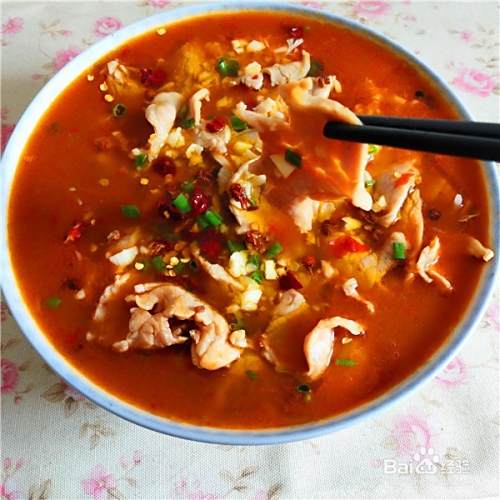 肉片煮好后,与汤一起倒入垫好绿豆芽的汤碗中,表面撒上一层蒜末、花椒粒、葱花和干红辣椒段,淋上热油,香味扑鼻,麻香麻香的,真是超级下饭哟。