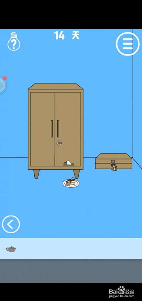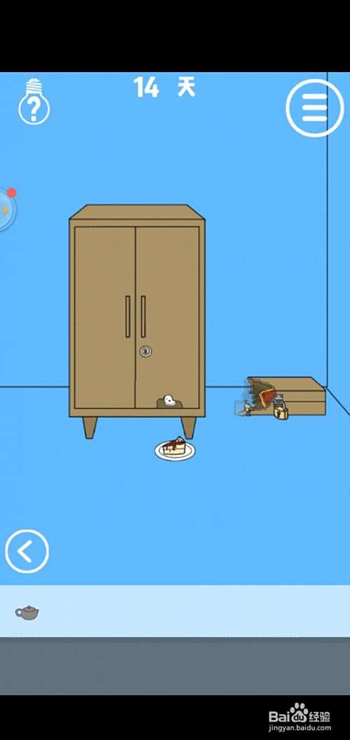 5、来到第二场景,将蛋糕拖动到衣柜前,然后会出来一只蚂蚁偷吃蛋糕,点击获取蚂蚁。