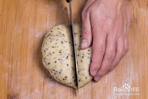 醒好的面团用刀分成两块。用擀面杖尽量擀薄,越薄越脆。