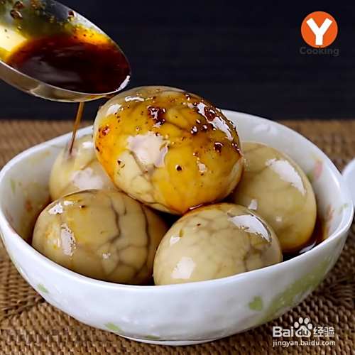 将煮熟的蛋蛋壳敲出蜘蛛网状,淋入辣油,再煮约3分钟后关火浸泡2小时。