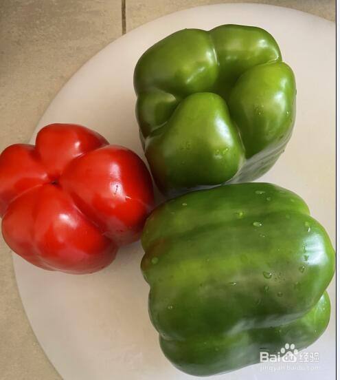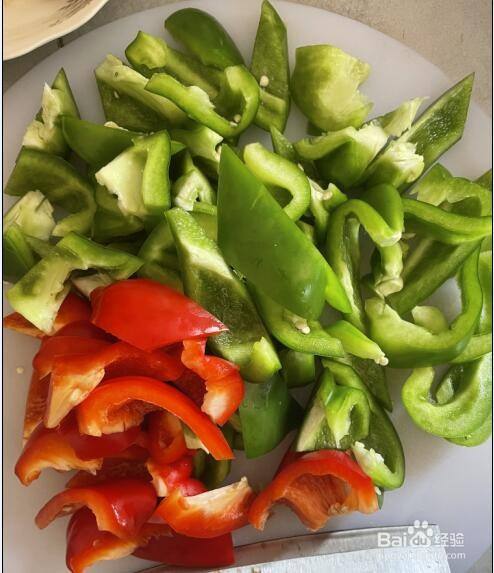 菜椒洗干净后,切成小块,如图;