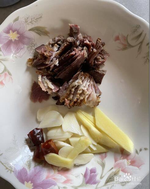 将生姜、大蒜去皮,洗净,切成片;腊肉洗净,切成片;红辣椒切成段,如图;