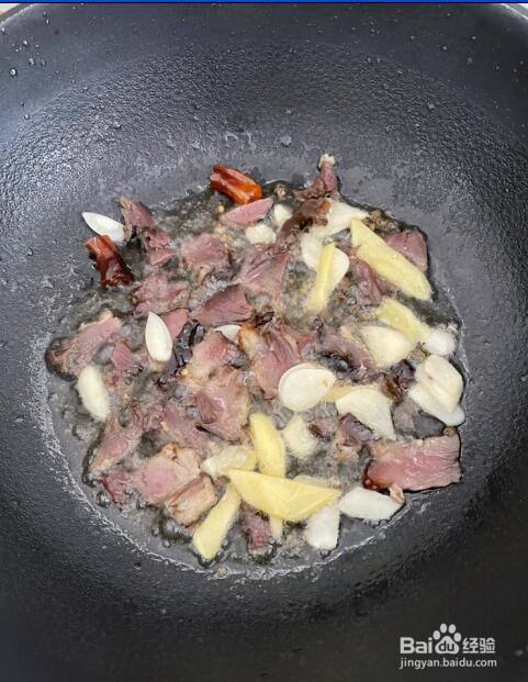 锅内倒入花生油,烧热后,倒入生姜、大蒜、干辣椒、腊肉一起翻炒,炒出香味;