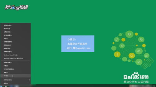 进入桌面,右击“开始”菜单,选择“运行”,输入“gpedit.msc”。