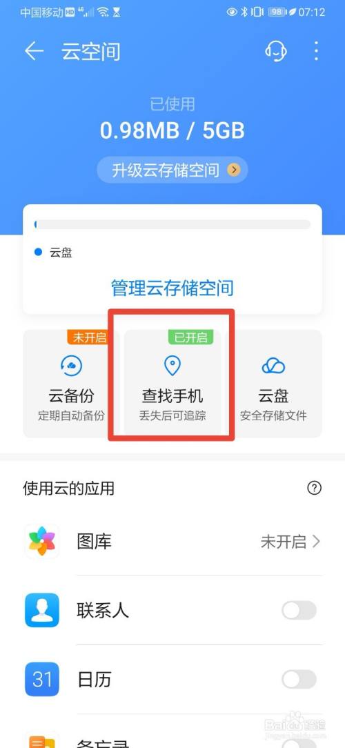 在手机上依次打开【设置】—【账号中心】—【云空间】,进入手机【云空间】页面后,打开【查找手机】选项,如下图所示。