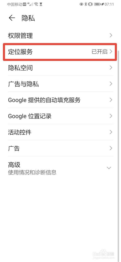 在隐私页面,选择打开【定位服务】选项,如下图所示。