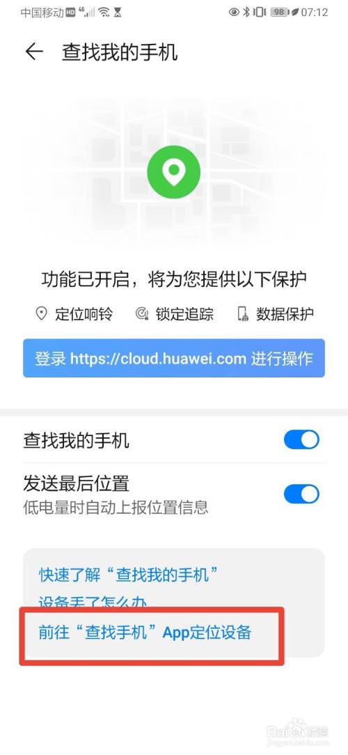 进入查找手机页面,选择【前往查找手机APP定位设备】选项,如下图所示。
