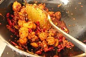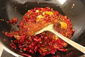 加入辣椒段炒至颜色红亮,辣味浓烈。