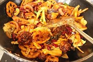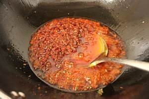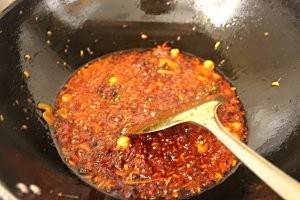 锅中留底油,放入豆瓣酱中火炒出香味,油色红亮,接着下干锅酱翻炒。