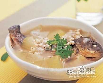 鲫鱼糯米粥:鲜鲫鱼1~2条,煮汤,捞出鱼肉,糯米100克放入鱼汤中煮粥食用。鱼肉亦可同时服食。有养阴利水,和胃消肿作用。适用于食欲不振,病后体虚,小便不利,下肢浮肿等症。
