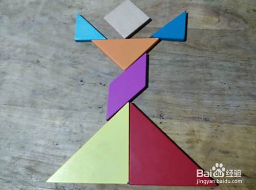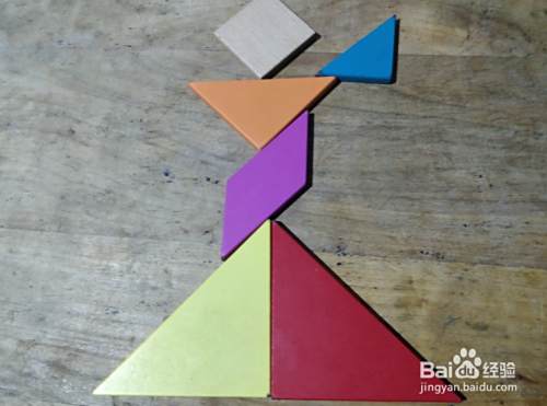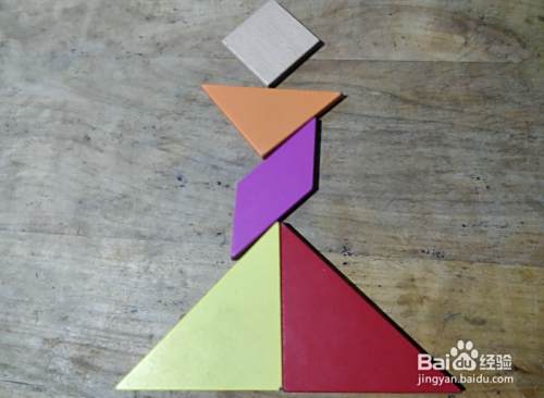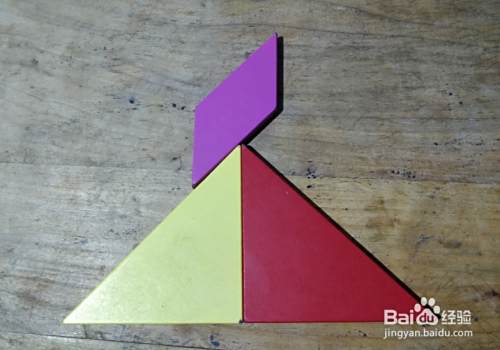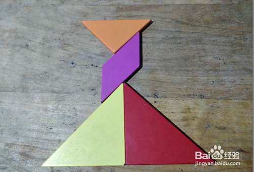 摆上蓝色三角形,放在橙色三角形的左上挨着,直角在左侧下端,如图。这样就拼组好了。
