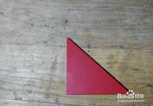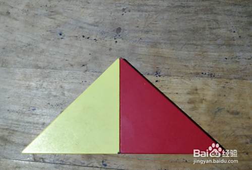 摆上黄色三角形,放在红色三角形的左侧挨着,下端一齐,如图。